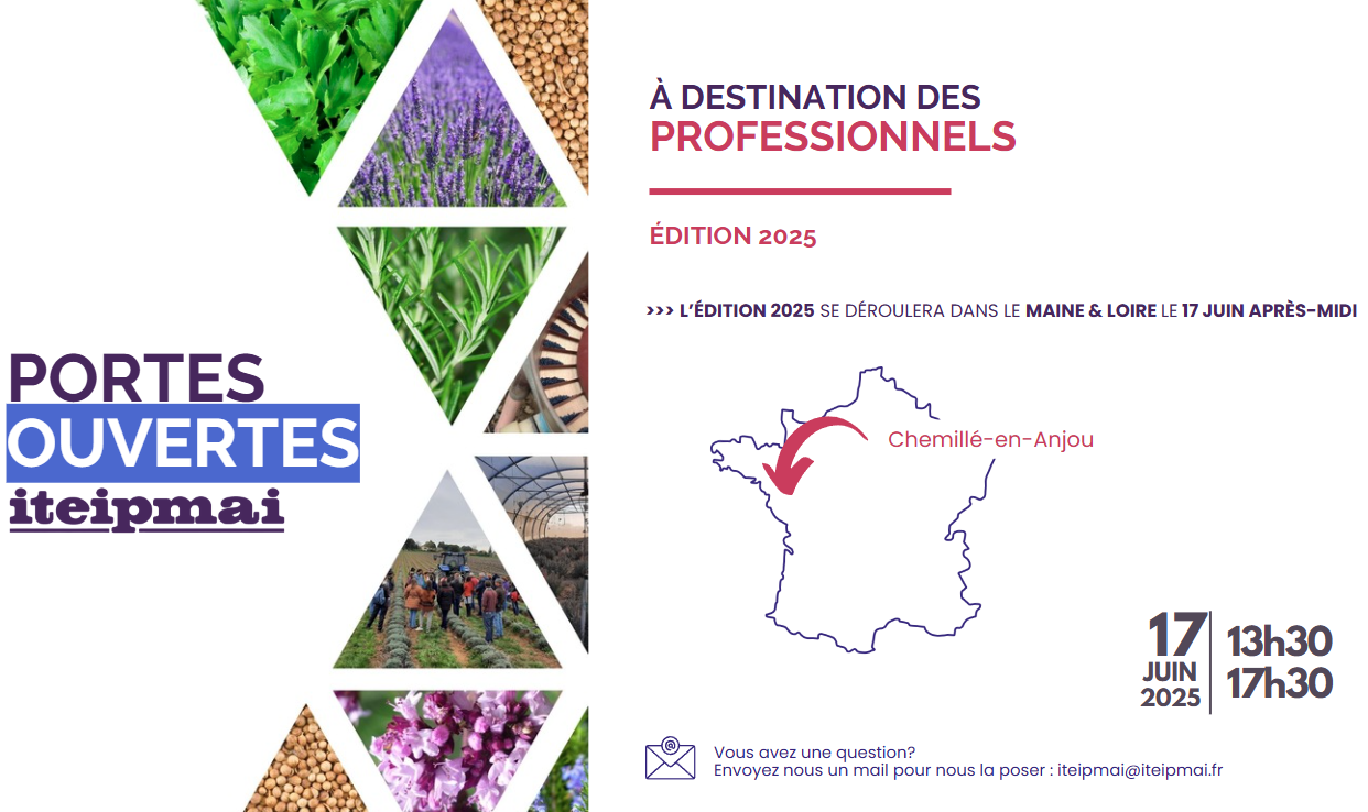 Contingut: l’Institut Technique Interprofessionnel des Plantes à Parfum, Aromatiques et Médicinales (ITEIPMAI), expert en recerca agronòmica de plantes aromàtiques i medicinals (PAM), obre les portes de les seves instal·lacions, oferint les següents activitats: