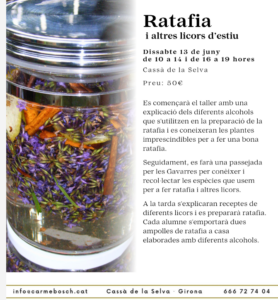 Contingut: Explicació dels diferents alcohols que s’utilitzen en la preparació de la ratafia i descobriment de les plantes imprescindibles. Passejada per les Gavarres per conèixer i recol·lectar les espècies emprades per l’elaboració de licors. Introducció a receptes de diferents licors i preparació de ratafia.